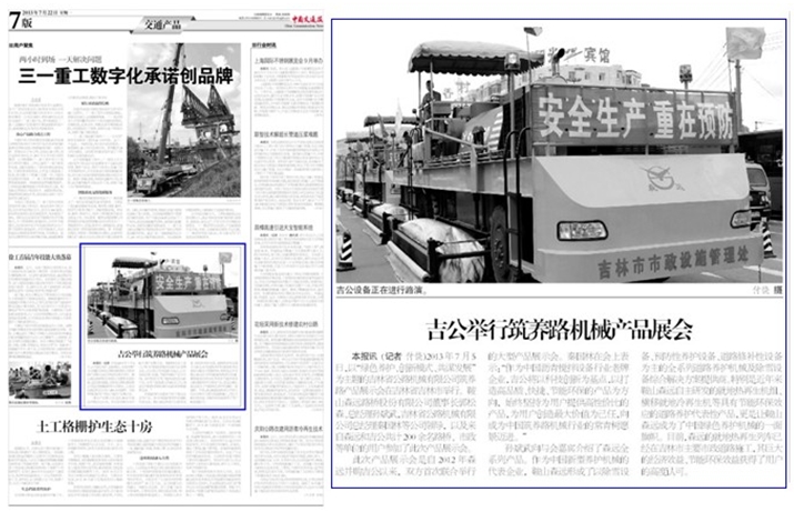 展示會得到諸多網絡媒體紛紛報道的同時,主流媒體平臺《中國交通報》也于2013年7月22日第七版對此次展會進行了報道,高度肯定了森遠、吉公在綠色筑養(yǎng)路行業(yè)新發(fā)展形勢下的旗幟作用,充分見證了森遠、吉公以諸多代表性產品服務市政道路建設、贏得行業(yè)市場、獲得用戶認可的不爭事實。